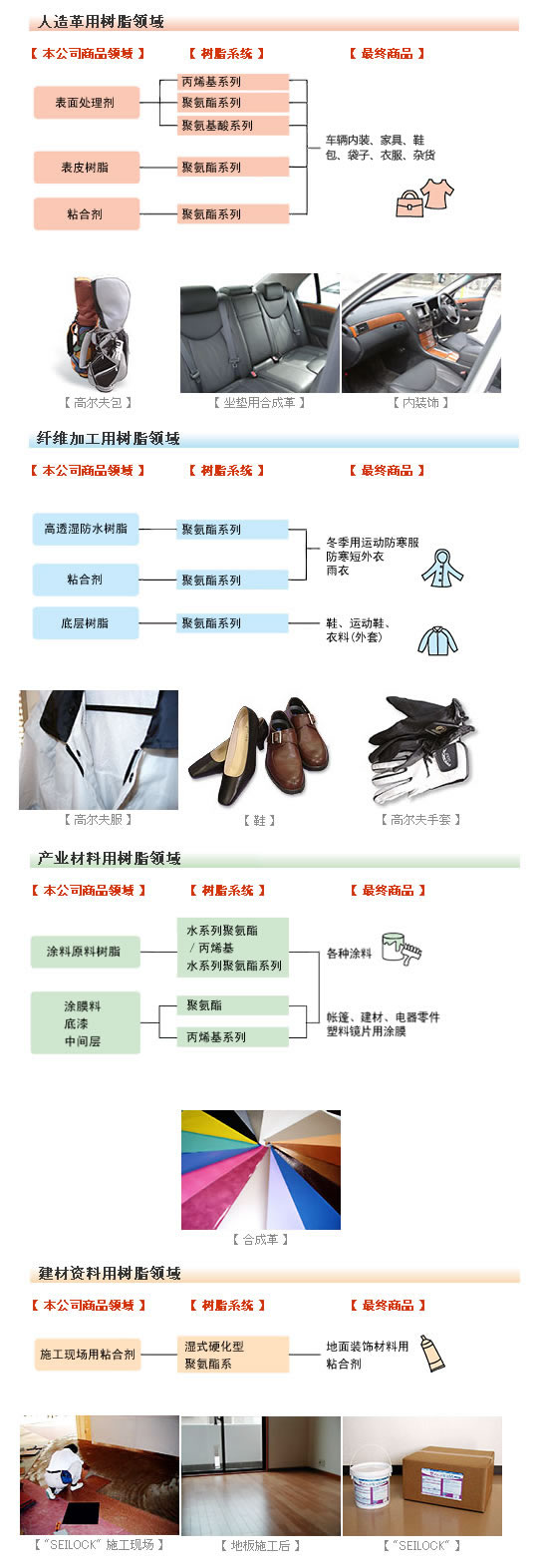 流行衣料用品、包装材料、滑雪服及帆船.帆板的帆等等运动.闲暇活动用品、信息、家电、 车辆内部装饰、杂货、办公用品等的原材料、可做壁纸等室内装饰用的树脂材料、以及市场末端客户使用的粘和剂等等、活跃在日常生活中所有领域里。