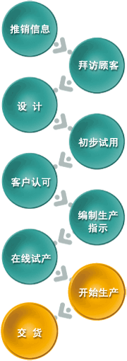 经过反复测试,各种物性达到满足时,开始生产小批量供客户试用,经过数次(一般一周至半年),得到客户认可时,由推销和客户签订交期等贸易条件。